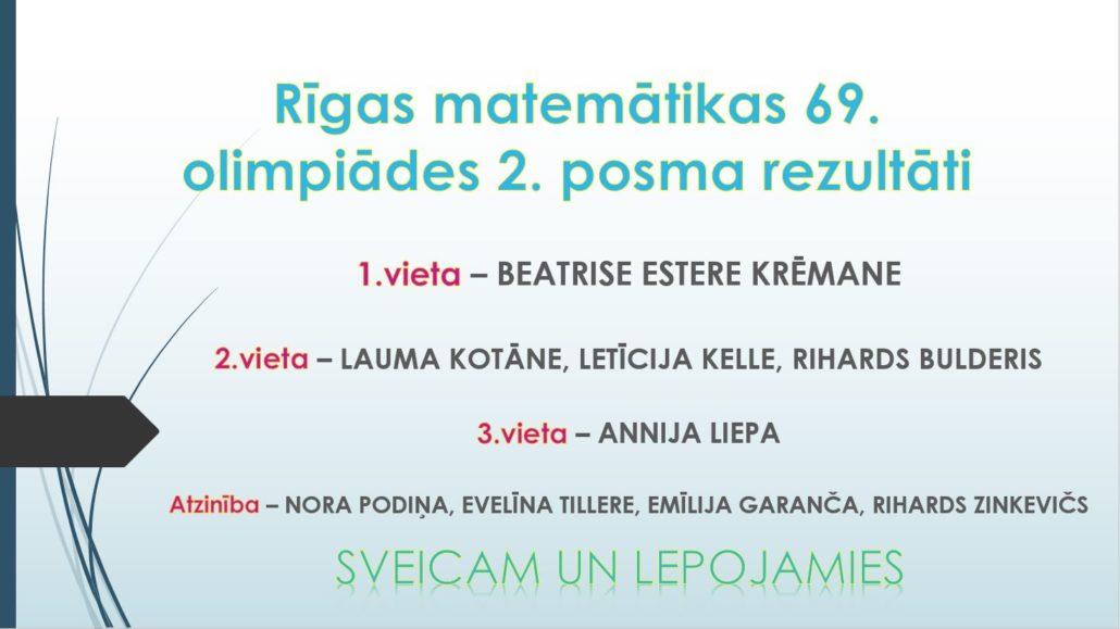Sveicam mūsu skolēnus ar augstiem panākumiem Rīgas pilsētas matemātikas 69. olimpiādes 2. posmā!