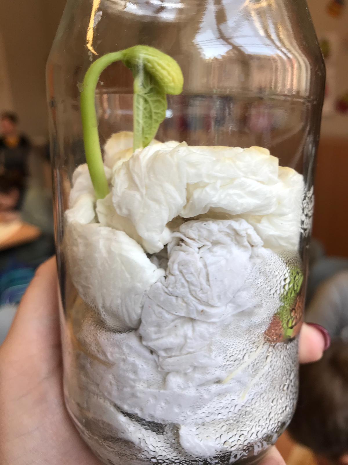 Neskatoties uz to, ka skolai nav ne mazdārziņa, ne plašu puķu dobju, tas netraucē Vides ekspertu pulciņa bērniem eksperimentēt un novērot, kā pupiņas aug arī salvetēs.