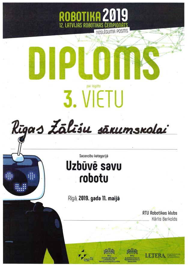 5.c klases skolēni – Henrijs, Emīls, Kārlis un Patriks kopā ar skolotāju Sandru Menci piedalījās 12. Latvijas Robotikas Čempionāta sacensībās, un ieguva godalgoto 3. vietu! Sveicam un lepojamies ar skolēniem! Paldies skolotājai Sandrai par atbalstu un ieguldīto darbu!