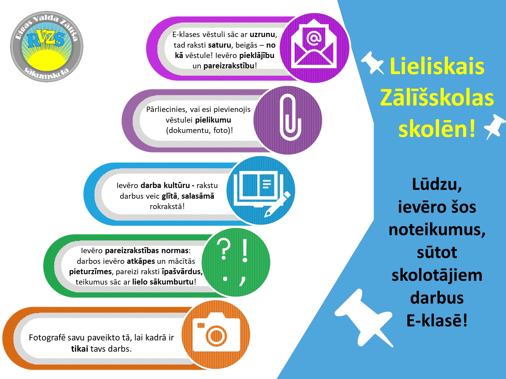 Esam veiksmīgi sākuši attālinātās mācības, un mēs, skolotāji, ļoti priecājamies par jūsu motivētību un centību darbu veikšanā. Tomēr, lai jūsu vēstules un mājās paveiktos uzdevumus mums saņemt būtu vēl lielāks prieks, vēlamies atgādināt, kādi noteikumi jāievēro, nosūtot skolotājiem darbus e-klasē.