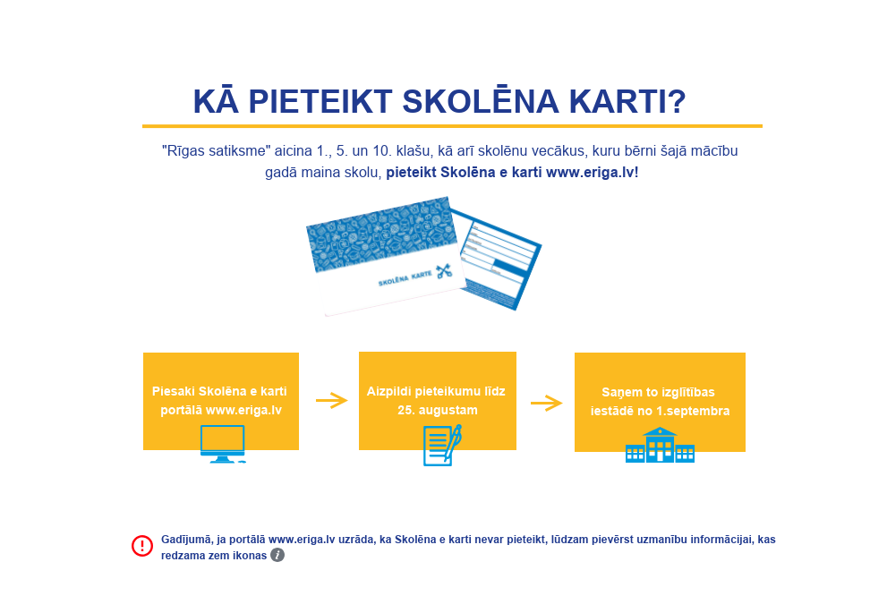 “Rīgas satiksme” aicina Rīgas 1., 5., un 10. klašu skolēnu, kā arī to skolēnu, kuri maina mācību iestādi, vecākus noformēt “Skolēna karti” portālā www.eriga.lv līdz 25. augustam.