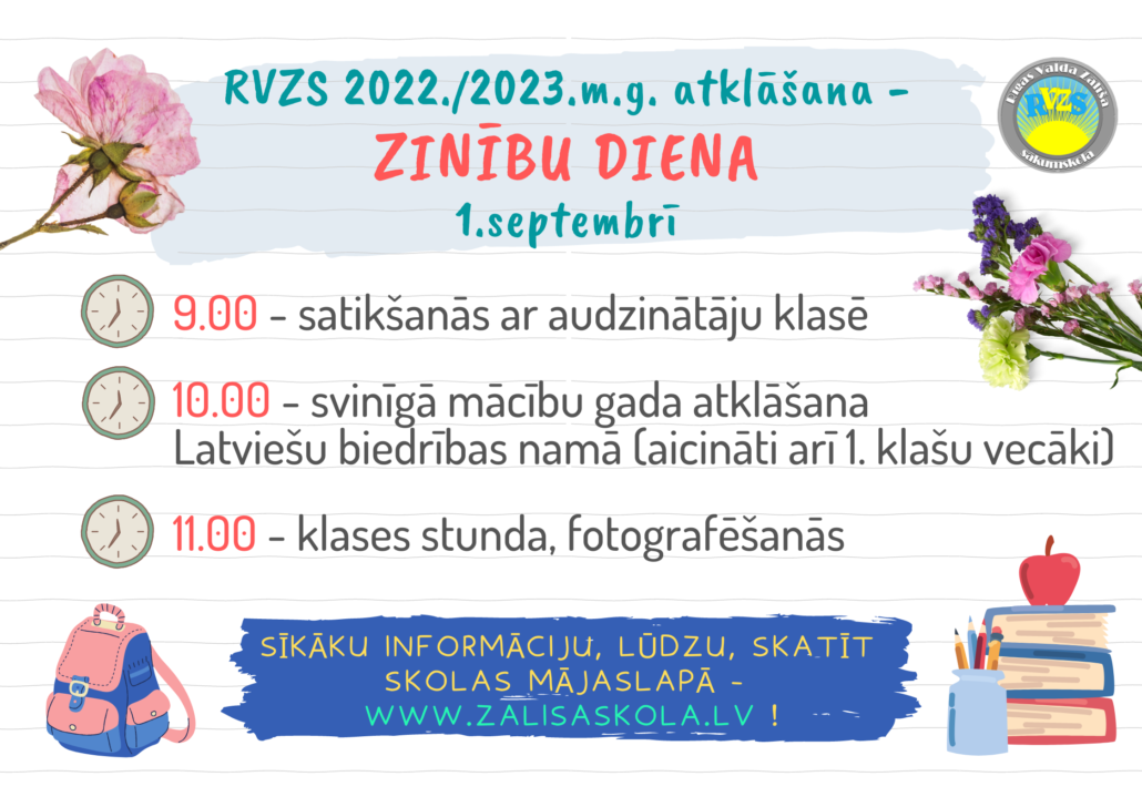 Atgādinām, ka svētkos skolā jāierodas svinīgā apģērbā atbilstoši skolas tradīcijām. Zēniem – uzvalks vai balts krekls un tumši zilas vai melnas bikses, meitenēm – balta blūze un tumši zili vai melni svārki.