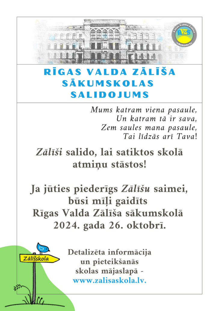 Ja jūties piederīgs Zālīšu saimei, būsi mīļi gaidīts Rīgas Valda Zālīša sākumskolā š.g. 26. oktobrī!