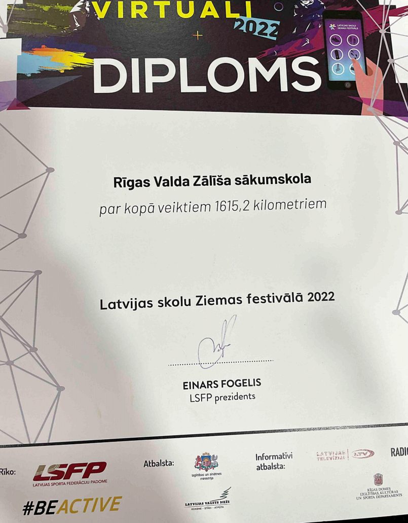 Rīgas Valda Zālīša sākumskola no 07.02.2022. – 14.02.2022. piedalījās Latvijas skolu Ziemas festivālā. Kopumā nedēļas laikā 36 skolēni un 3 skolotāji veica 1615,2 km dažādās distancēs, kas kopvērtējumā 166 skolu konkurencē deva 14. vietu Latvijā un 2. vietu Rīgā.