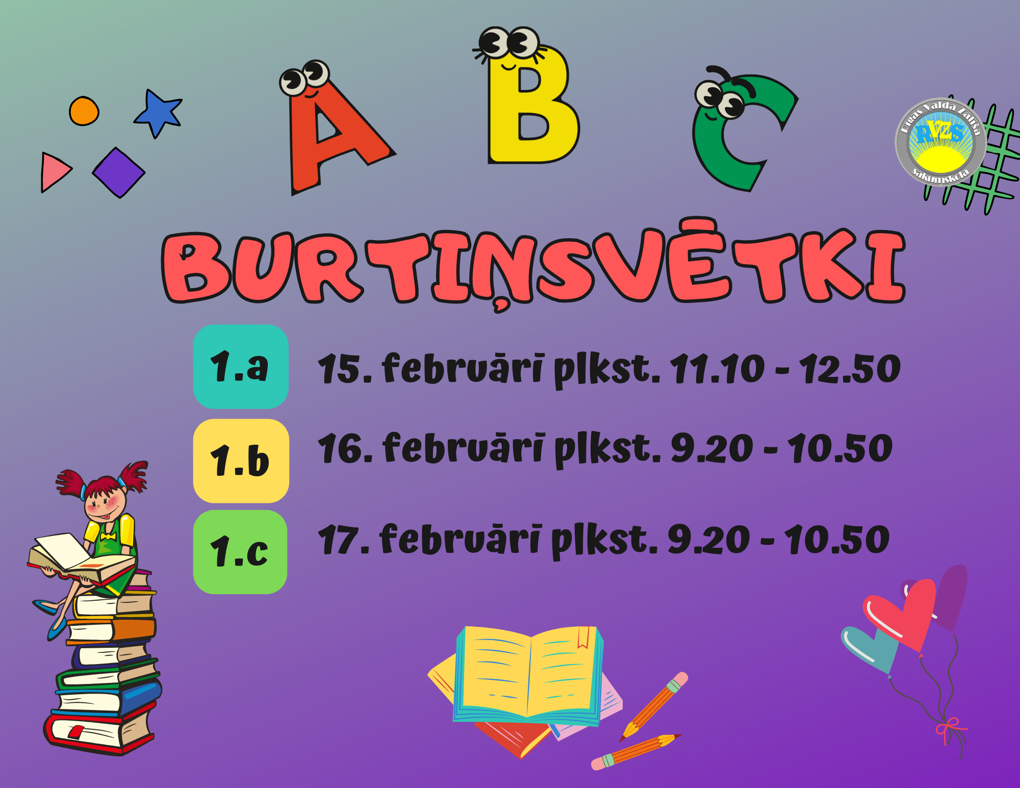 1.klašu skolēni no 15.02. līdz 17.02. svinēja nozīmīgus svētkus – “Burtiņsvētkus”. Svētkos brašie pirmklasnieki kopīgās spēlēs, dziesmās, dejās un stafetēs izdzīvoja kopā būšanu un atzina, ka šī bijusi viena no labākajām dienām skolā. Katram bija iespēja pierādīt, ka zina alfabētu, prot lasīt, veidot teikumus un pat minēt vispiņķerīgākās mīklas. Skaidrs ir viens – komandā ir spēks! Drosmīgākie pat deklamēja sagatavotos dzejoļus.