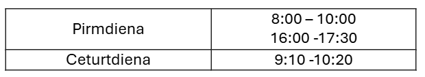 Pieņemšanas laiki, iepriekš piesakoties, rakstot uz e-pastu eritere@edu.riga.lv , telefoniski, vai rakstot E-klases pastā: