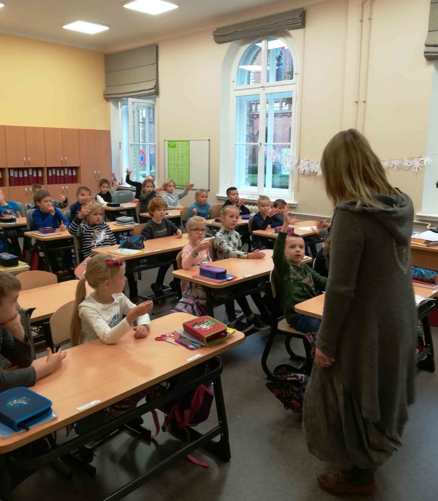 1.b klasei bija izzinoša nodarbība par rakstu kultūru, kuru vadīja stāstniece Līga Reitere. Tika pastāstīts par laba rakstāmrīka izvēles nepieciešamību, kā arī nodarbības laikā tika parādīti dažādi pirkstu vingrinājumi, lai sekmīgāk varētu apgūt burtu rakstību. Tika demonstrēta greznu burtu rakstīšana. Bērnus ļoti “aizrāva” stāsts par burvju kronīti.